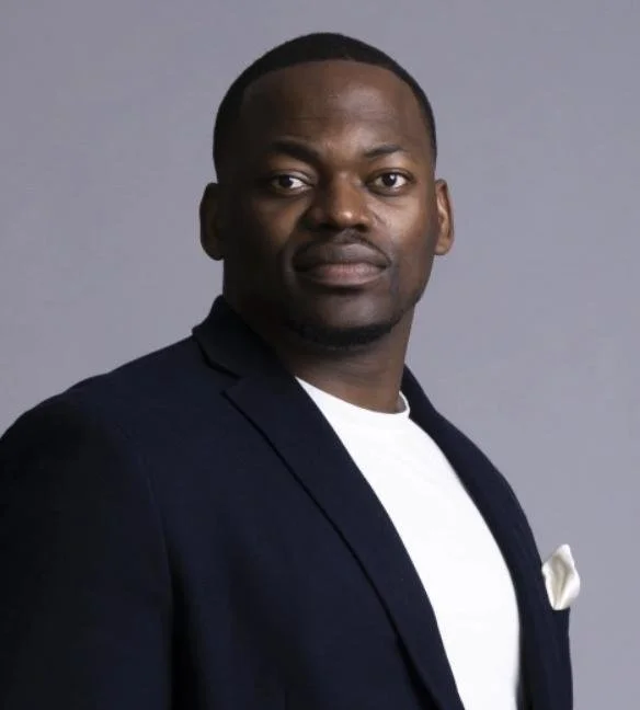 • Henoc Muamba wearing a dark blazer and white shirt stands in front of a plain gray background.